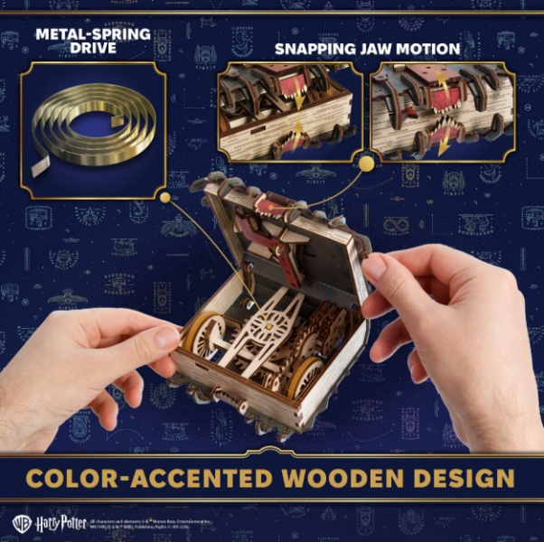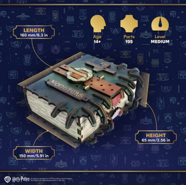 Dřevěná 3D skládačka Monster Book of Monsters ze série Harry Potter™ od společnosti Ugears kombinuje hravý design s důmyslným technickým řešením. Model je vybaven mechanismem s páskem, který knihu zajišťuje na místě. Natočte šňůru na zadní straně na maximální napětí, položte model na rovnou plochu a uvolněte řemínek – model se pak rozjede dopředu a jeho obálka se otevírá a zavírá jako čelisti originální rekvizity. Pro ještě větší efekt se těsně před úplným uvolněním otevřou oči, což napodobuje moment, kdy kniha ve filmu ožívá. Tento sběratelský mechanický model je jak vzrušující stavebnicí, tak úchvatným výstavním kouskem pro každého fanouška Harryho Pottera™.